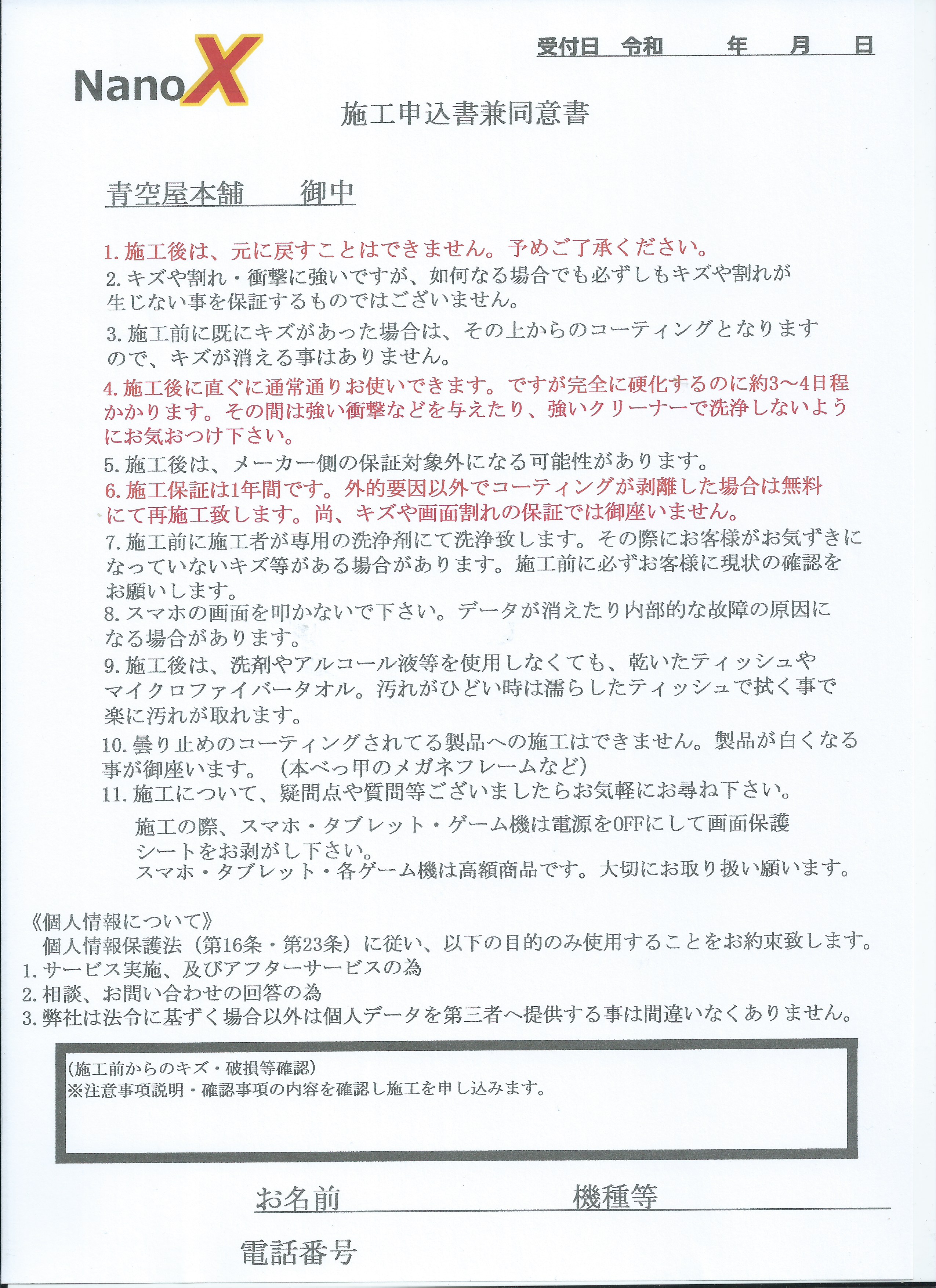 ご依頼いただくにあたって、「施工申込書兼同意書」のご記入をお願いしております。